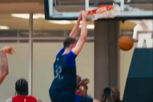 训练当中,浓眉持球背转身遭遇两人包夹,与弗拉格打出精妙高低位配合,后者得球暴扣终结。