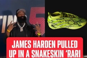 体育资讯10月5日讯 今日快船球星哈登脚踏“蛇纹”配色9代战靴,搭配同款蟒纹车衣法拉利惊艳亮相《Starting 5》第二季首映礼。