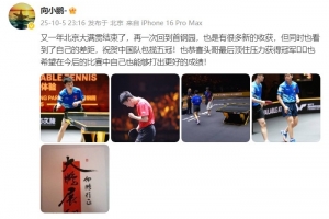 体育资讯10月6日讯 WTT北京大满贯全部比赛结束,向鹏在男单1/4决赛中以4-3逆转世界排名第三的雨果杀入半决赛,虽然半决赛惜败给队友王楚钦,但本站赛事他表现还是相当出色。本站赛事结束后,向鹏社媒分享比赛照片,祝贺中国队包揽五冠,恭喜王楚钦男单夺冠,并自勉希望在以后的比赛中取得更好的成绩。