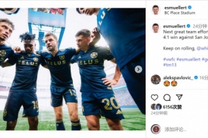 穆勒社媒晒出与队友的合照,配文:“又一场出色的团队表现,4-1击败圣何塞。继续前进,温哥华白浪!”