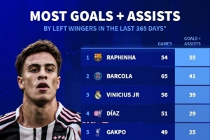 体育资讯10月6日讯 德国转会市场统计了五大联赛左边锋过去一年各赛事的参与进球数量,拉菲尼亚参与55球居首,伊尔迪兹参与24球排名第6位,值得一提的是,伊尔迪兹的德转身价将在明天更新。