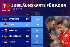 体育资讯10月7日讯 德国转会市场统计了球员在德甲联赛中吃到黄牌的数量,并列出榜单,埃芬博格111黄居首,科赫100黄次席。