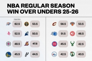 体育资讯10月8日讯 博彩公司BetMGM给出了新赛季NBA各队常规赛的胜场盘口指数,其中雷霆的胜场盘口指数为62.5,是所有球队中最高的。这可以大致理解为博彩公司认为雷霆的胜场数最有可能就是62、63场这几个接近的数字。