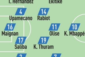 队报预测法国队首发:迈尼昂;特奥、于帕梅卡诺、萨利巴、古斯托;拉比奥特、K-图拉姆、埃基蒂克、奥利塞、科曼;姆巴佩