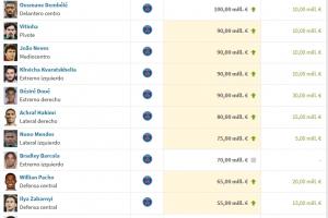 体育资讯10月10日讯 今日德转更新法甲球员身价,登贝莱身价上涨至1亿欧排名法甲第1,维蒂尼亚、内维斯、克瓦拉茨赫利亚、杜埃四人身价高达9000万欧,法甲身价前10位都为巴黎球员。