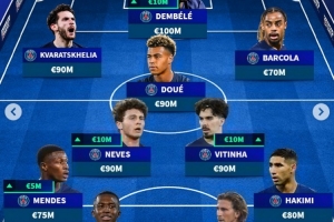 前锋:克瓦拉茨赫利亚 9000万欧,登贝莱 1亿欧,巴尔科拉 7000万欧