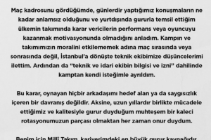 当看到比赛名单时,我才意识到这些天来的沟通毫无意义——那些在海外为国争光的球员,在国家队决策者眼中,其表现和斗志根本不被重视。为避免影响集训营和球队士气,我选择在返回伊斯坦布尔后向技术团队传达了我的想法,而非在比赛期间或赛后,随后在‘技术和管理团队知情并同意’的情况下,我自愿离开了集训营。