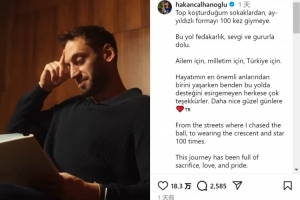 恰尔汗奥卢达成国家队出战100场里程碑,他在社交媒体上写道:“从在街头追逐足球,到身披星月战袍(土耳其队球衣)出战百场。这段旅程充满了牺牲、热爱与骄傲。为我的家人,为我的祖国,为土耳其。”