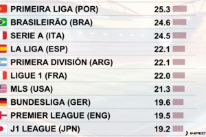 体育资讯10月13日讯 CIES足球天文台统计了全球联赛每90分钟犯规情况,其中葡超以25.3次犯规位居榜首,巴甲则以24.6位居次席。
