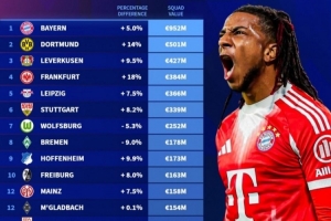 1、拜仁慕尼黑,总身价9.52亿欧元,涨5.0%
