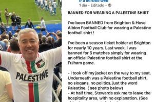 “我是布莱顿近10年的季票持有者。上周,因为在对阵富勒姆的比赛中穿了一件巴勒斯坦官方足球球衣,我被禁赛5场。”