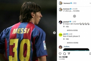 梅西发布了一张他身穿巴萨30号球衣的经典旧照,并配文写道:“已经21年了……难以置信。”