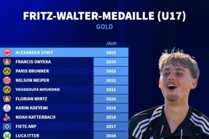 体育资讯10月17日讯 法兰克福前锋斯塔夫当选德国U17年度最佳新秀,德国转会市场列出了历届德国U17年度最佳新秀名单。