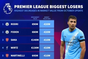 体育资讯10月17日讯 德转统计了最新的英超球员身价跌幅榜单,曼城中场罗德里和福登身价均下降2000万欧元,分列前二,阿森纳四人上榜。