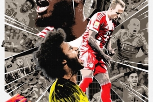 海报是充满张力的拼贴画风格,拜仁后卫于帕梅卡诺、凯恩一同出镜,背景还有昔日对决瞬间。