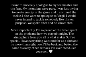 戈登赛后在社交媒体上写道:“我想要真诚地向我的队友和球迷们道歉。我的意图很单纯,我只是想在比赛中激发一些活力,但这次铲球时机把握得不好。我也要向范迪克道歉,我绝不会故意这样铲人。我们之后聊过,他知道这一点。