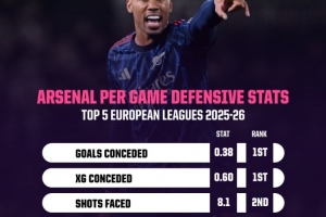 数据统计显示,阿森纳本赛季5项防守端关键数据均位列英超前二: