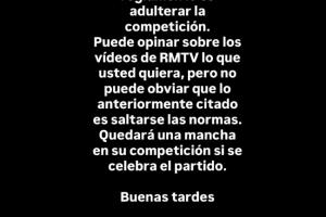 卡瓦哈尔:你好,特巴斯先生。违反规定就是玷污比赛。你可以对此前皇马TV发布的视频发表你想要说的任何意见。但你不能否认之前所提到的内容(海外赛)就是违反了规则。如果进行海外赛,你的比赛就会有污点。