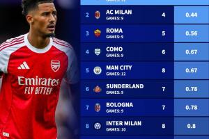 体育资讯10月22日讯 凌晨欧冠比赛阿森纳4-0完胜马竞,赛后德转官方统计本赛季五大联赛球队丢球最少榜,阿森纳12场仅丢3球排名榜单第一。以下是根据场均丢球数的排名↓