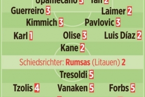体育资讯10月23日讯 在本轮欧冠,拜仁4-0大胜布鲁日。《图片报》也对拜仁球员本场表现做出评分,具体如下(德媒评分1分最高,5负最低):