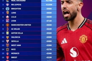 以下为今年五大联赛球队身价跌幅榜top20: