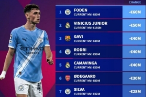 体育资讯10月25日讯 德转盘点了在2025年足坛球员身价跌幅榜,其中福登下跌6000万欧最多,以下为具体榜单: