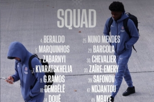 前锋:7-克瓦拉茨赫利亚、9-贡萨洛-拉莫斯、10-登贝莱、14-杜埃、29-巴尔科拉、47-恩贾恩图、49-姆巴耶