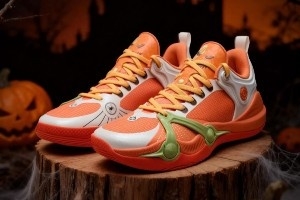 球鞋也采用了比较经典的和万圣节相关的橙色作为主色调,鞋舌上也有万圣节南瓜人元素刺绣。