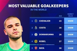 体育资讯11月1日讯 德国转会市场统计了门将的身价,并列出榜单,多纳鲁马、科贝尔、拉亚等5人并列居首。