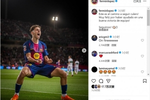 费尔明社媒晒出激情庆祝的照片,配文:“这就是前进的方向!非常高兴能为这场漂亮的团队胜利贡献力量!继续加油!”