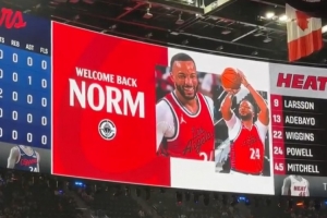 体育资讯11月4日讯 快船主场迎战热火,首节暂停期间,球队播放了致敬旧将鲍威尔的视频,鲍威尔也鼓掌致谢。