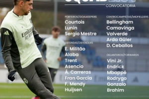 体育资讯11月8日讯 本轮西甲皇马将在客场对阵巴列卡诺,球队官方也公布了本场大名单,琼阿梅尼缺席,具体如下: