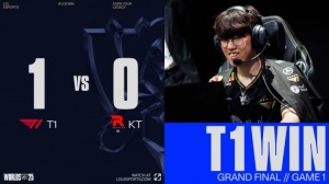 第一局前期Oner赵信河道被抓送Bdd瑞兹一血,Keria波比下路越塔强行换掉deokdam艾希,小吕布被随后来下的KT野辅逮捕。紧接着PerfecT兰博上路肉身勾引成功,多兰与Keria双双阵亡,KT拿到2k经济优势。