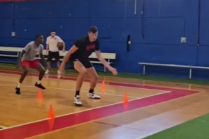 视频中,克林根和小个球员一起进行脚步训练,开拓者官博配文道:“💪6尺vs7尺,来和大根一起练练脚步。”