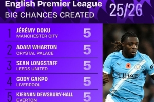 本赛季英超创造重大机会榜: