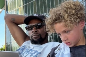体育资讯8月20日讯 今日美媒Courtside Buzz社媒发布了歌手Drake的7岁儿子与凯文-杜兰特一起玩平板的照片。图片中杜兰特戴着墨镜气质独特。