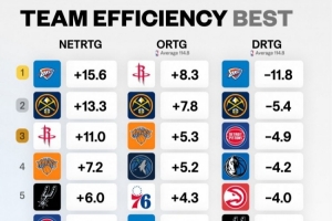 体育资讯11月14日讯 美媒Basketball University发布了赛季至今的各队净效率、进攻效率以及防守效率前十的帮当。其中雷霆净效率+15.6排名第一,进攻效率火箭+8.3排名第一,防守效率雷霆-11.8排名第一。