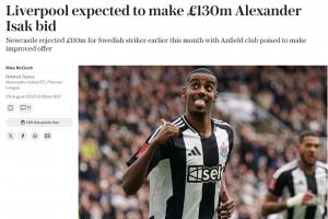 体育资讯08月29日讯 据英国媒体《每日电讯报》报道,利物浦将提出对伊萨克的第二份报价,转会费预计超过1.3亿英镑。