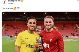 利物浦中场亚历克西斯·麦卡利斯特和他的哥哥凯文·麦卡利斯特(圣吉罗斯后卫)都入选了本期阿根廷队,利物浦官方社媒晒出麦卡兄弟的合照,配文:“兄弟。”