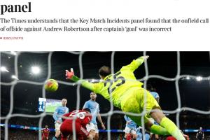体育资讯11月14日讯 英媒《泰晤士报》报道,英超专家组已经裁定,上轮英超范戴克对曼城的进球应被判有效。