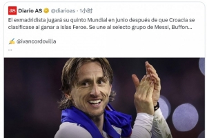40岁克罗地亚中场莫德里奇将迎来自己的第5届世界杯,西班牙媒体《阿斯报》主编、皇马球迷龙赛罗转发相关新闻,配文:“永恒的莫德里奇,伟大的卢卡(莫德里奇)!”