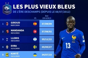 体育资讯11月15日讯 世预赛欧洲区比赛,坎特踢满全场,帮助法国主场4-0击败乌克兰,德转列出了德尚执教法国队以来年龄最大出场球员排名,吉鲁居首,坎特排在第5位。