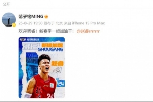 范子铭更新个人微博,欢迎了新队友的到来,写道:“欢迎我睿!新赛季一起加油干!”