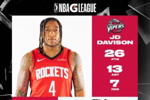 效力于毒蛇的火箭双向合同球员JD·戴维森和以赛亚·克劳福德表现出色,分别贡献26分7篮板13助攻,和27分7篮板。