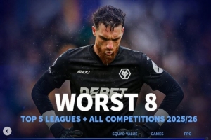 体育资讯11月21日讯 五大联赛即将重燃战火,《转会市场》统计了本赛季至今五大联赛球队的各项赛事场均拿分最少情况,英超的狼队以场均0.57分垫底。