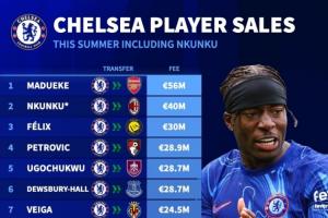 据德转统计,切尔西今夏卖人总收入将达到3.165亿欧元,冠绝全球,比卖人榜第二位的伯恩茅斯多了近8000万欧元。