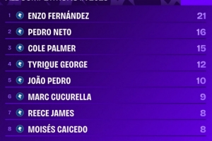 据Squawka统计,恩佐·费尔南德斯2025年打进11球,助攻10次,他是切尔西队内同期唯一进球、助攻皆上双的球员。