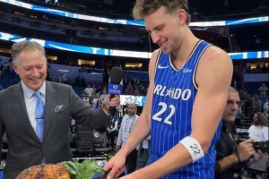 这是魔术在感恩节前(当地时间下周四)的最后一个主场比赛,赛后小瓦格纳在魔术主场切火鸡提前庆祝节日。