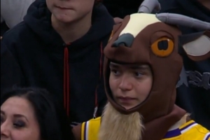 比赛期间镜头抓拍到场边一位女球迷身穿詹姆斯球衣并戴着山羊(GOAT)帽子。