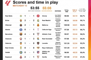 西甲第13轮净比赛时间排名:
